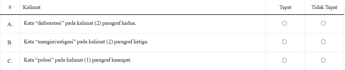1. Manakah kalimat yang memiliki penggunaan kata serapan yang tepat? Tentukan Tepat atau Tidak Tepat pada setiap pernyataan berikut