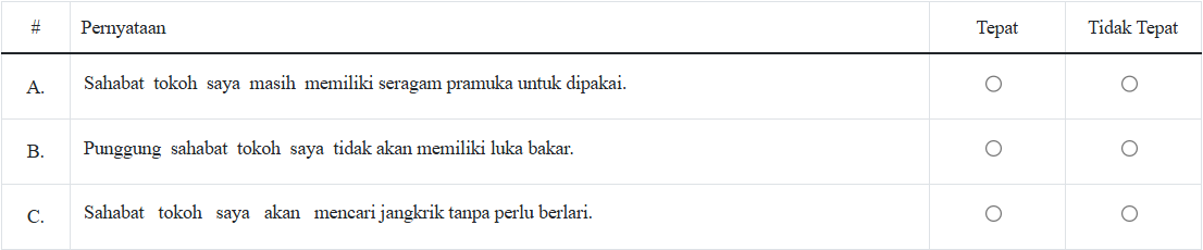 9. Peristiwa apa yang mungkin akan terjadi kepada sahabatnya jika tokoh saya tidak ikut mencari jangkrik malam itu? Tentukan Tepat atau Tidak Tepat untuk setiap pernyataan berikut!